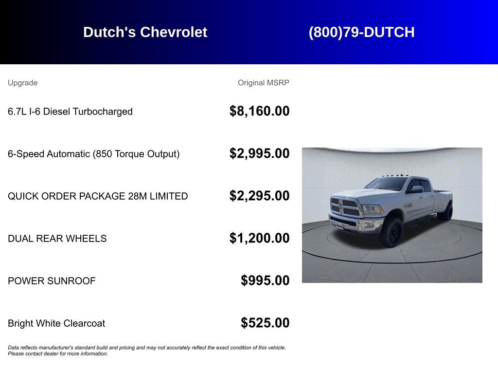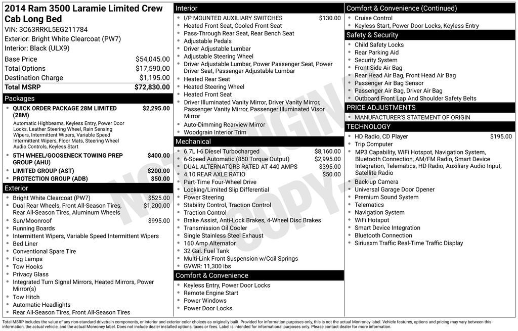 10 Speakers, 115V Auxiliary Power Outlet, 17 x 6 Premium Aluminum Wheels, 220 Amp Alternator, 4-Wheel Disc Brakes, 4.10 Rear Axle Ratio, 5th Wheel/Gooseneck Towing Prep Group, 6000# Front Axle w/Hub Ext, ABS brakes, Adjustable pedals, Air Conditioning, Alloy wheels, AM/FM radio: SiriusXM, Audio memory, Auto High Beam Headlamp Control, Auto-dimming Rear-View mirror, Automatic temperature control, Body Color Fender Flares, Box & Rear Fender Clearance Lamps, Brake assist, Bright Front Bumper, Bright Rear Bumper, Bucket Seats, Center Hub, Chrome Bodyside Molding, Chrome Tubular Side Steps, Clearance Lamps, Compass, CTR Stop Lamp w/Cargo View Camera, Delay-off headlights, Driver door bin, Driver vanity mirror, Dual Alternators Rated At 440 Amps, Dual front impact airbags, Dual front side impact airbags, Dual Rear Wheel Fender Flare Tracking, Dual Rear Wheels, Electronic Stability Control, Electronically Controlled Throttle, Emergency communication system, Folding Flat Load Floor Storage, Front anti-roll bar, Front Bucket Seats, Front Bumper Sight Shields, Front Center Armrest w/Storage, Front dual zone A/C, Front fog lights, Front reading lights, Front Wheel Spats, Fully automatic headlights, Garage door transmitter, Genuine wood dashboard insert, Genuine wood door panel insert, Heated door mirrors, Heated Front Seats, Heated front seats, Heated rear seats, Heated Second Row Seats, Heated Steering Wheel, Heated steering wheel, High Back Seats, I/P Mounted Auxiliary Switches, Illuminated entry, Instrument Cluster, Keyless Enter-N-Go, Leather steering wheel, Leather Wrapped Grab Handle, Limited Badge, Limited Decor Group, Limited Group, Low tire pressure warning, Luxury Door Trim Panel, Luxury Front & Rear Floor Mats, Manufacturer's Statement of Origin, Memory seat, Navigation System, Occupant sensing airbag, Outside temperature display, Overhead airbag, Overhead console, Painted Front Bumper, Painted Rear Bumper, Panic alarm, ParkView Rear Back-Up Camera, Passenger door bin, Passenger vanity mirror, Pedal memory, Power 10-Way Memory Driver & 6-Way Passenger Seats, Power door mirrors, Power driver seat, Power Lumbar Adjust, Power passenger seat, Power steering, Power Sunroof, Power windows, Premium Leather Bucket Seats, Premium Leather-Trimmed Bucket Seats, Protection Group, Quick Order Package 28M Limited, Radio data system, Radio: Uconnect 8.4AN AM/FM/SXM/HD/BT/NAV, Rain Sensitive Windshield Wipers, Rear 60/40 Split Folding Seat, Rear seat center armrest, Rear step bumper, Rear View Auto Dim Mirror w/Display, Remote keyless entry, Remote Proximity Keyless Entry, Remote Start System, Security system, Single Disc Remote CD Player, Speed control, Split folding rear seat, Steering Wheel Mounted Audio Controls, Steering wheel mounted audio controls, Tachometer, Tilt steering wheel, Tip Start, Tire Pressure Monitoring Delete, Traction control, Transmission Oil Cooler, Trip computer, Turn signal indicator mirrors, Variably intermittent wipers, Ventilated Front Seats, Ventilated front seats, Voltmeter, Wheel to Wheel Side Steps, Wheels: 18 x 8.0 Aluminum White Gold, Wood/Leather Wrapp