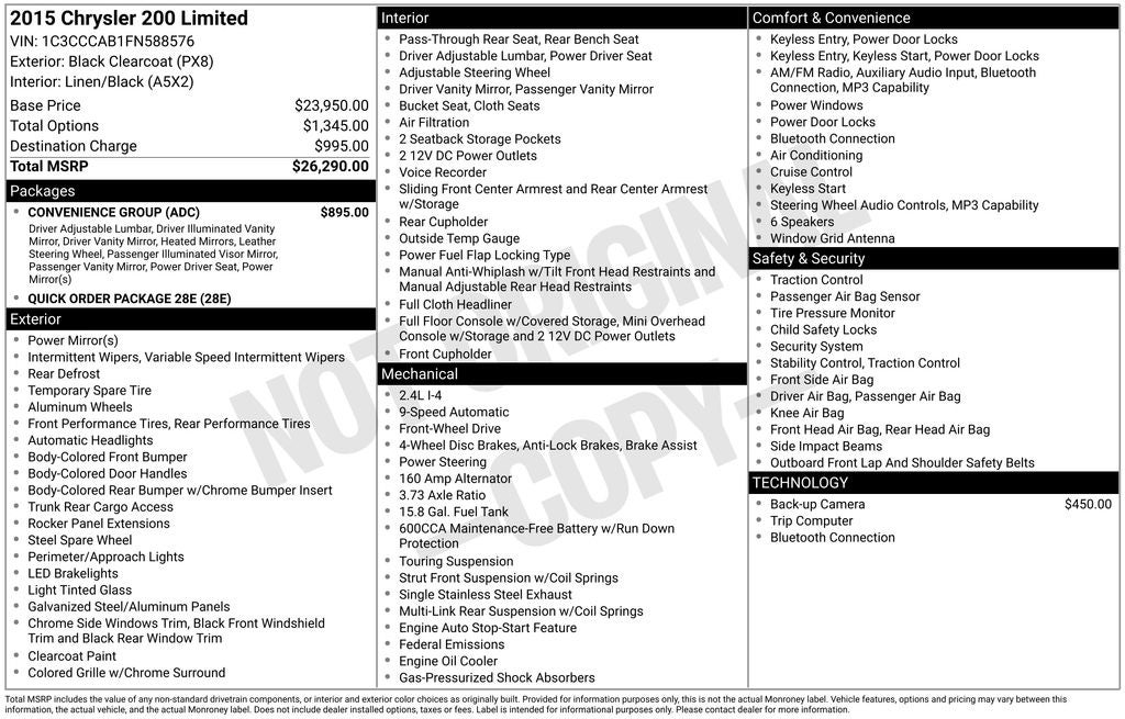 Black Clearcoat 2015 Chrysler 4D Sedan 200 Limited 2.4L I4 MultiAir FWD