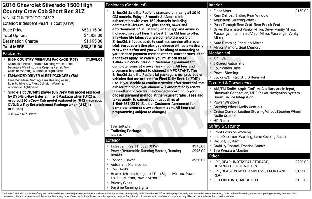 8-Speed Automatic with Overdrive, 4WD, Saddle Leather, 110-Volt AC Power Outlet, 150 Amp Alternator, 3.42 Rear Axle Ratio, 4 Movable Upper Cargo Tie Downs, 4-Wheel Disc Brakes, 4.2 Diagonal Color Display Driver Info Center, 6 Chrome Tubular Rectangular Assist Step Delete, 6 Rectangular Chromed Tubular Assist Steps, 7 Speakers, ABS brakes, Air Conditioning, Alloy wheels, AM/FM radio: SiriusXM, Auto-dimming door mirrors, Auto-Dimming Inside Rear-View Mirror, Auto-dimming Rear-View mirror, Automatic temperature control, Auxiliary External Transmission Oil Cooler, Bluetooth® For Phone, Body Color Rear Bumper w/Cornersteps, Bodyside moldings, Bose Speaker System, Brake assist, Bumpers: body-color, CD player, Chrome Bodyside Moldings, Chrome Cap Power-Adjustable Heated Outside Mirrors, Chrome Door Handles, Chrome Grille Surround, Chrome Mirror Caps, Chrome wheels, Color-Keyed Carpeted Floor Mats, Color-Keyed Carpeting w/Rubberized Vinyl Floor Mats, Compass, Deep-Tinted Glass, Delay-off headlights, Driver & Front Passenger Illuminated Vanity Mirrors, Driver door bin, Driver vanity mirror, Dual front impact airbags, Dual front side impact airbags, Dual-Zone Automatic Climate Control, Electric Rear-Window Defogger, Electronic Stability Control, Emergency communication system: OnStar Guidance, Enhanced Driver Alert Package, Exterior Parking Camera Rear, EZ Lift & Lower Tailgate, Floor Mounted Console, Forward Collision Alert, Front & Rear All-Weather Floor Mats, Front & Rear Black Bowtie Emblems (LPO), Front anti-roll bar, Front Body-Color Bumper, Front Bucket Seats, Front Center Armrest w/Storage, Front dual zone A/C, Front fog lights, Front Frame-Mounted Black Recovery Hooks, Front Full Feature Power Reclining Bucket Seats, Front reading lights, Front wheel independent suspension, Fully automatic headlights, Garage door transmitter, HD Radio, Heated & Vented Front Seating, Heated door mirrors, Heated front seats, Heavy Duty Suspension, Heavy-Duty Rear Locking Differential, High Country Premium Package, Illuminated entry, Integrated Trailer Brake Controller, IntelliBeam Automatic High Beam On/Off Headlight, Lane Keep Assist, Leather Wrapped Heated Steering Wheel, Leather Wrapped Steering Wheel w/Cruise Controls, LED Cargo Box Lighting, LED Taillamps w/Signature, Low tire pressure warning, Manual Tilt/Telescoping Steering Column, Memory seat, Navigation System, Occupant sensing airbag, OnStar 6 Months Guidance Plan, OnStar w/4G LTE, Outside temperature display, Overhead airbag, Overhead console, Panic alarm, Passenger door bin, Passenger vanity mirror, Perforated Leather Appointed Seat Trim, Polished Exhaust Tip, Power Adjustable Pedals, Power door mirrors, Power driver seat, Power passenger seat, Power Sliding Rear Window, Power steering, Power windows, Power Windows w/Driver Express Up, Power-Retractable Assist Steps, Preferred Equipment Group 3LZ, Premium audio system: Chevrolet MyLink, Radio data system, Radio: AM/FM 8 Diagonal Clr Touch Nav, Rear 60/40 Folding Bench Seat (Folds Up), Rear reading lights, Rear seat center armrest, Rear step bumper, Rear Under-Seat Composite Storage Bin (LPO), Rear Vision Camera w/Dynamic Guide Lines, Rear Wheelhouse Liners, Rear window defroster, Remote Keyless Entry, Remote keyless entry, Remote Locking Tailgate, Remote Vehicle Starter System, Security system, Single Slot CD/MP3 Player, SiriusXM Satellite Radio, Speed control, Speed-sensing steering, Split folding rear seat, Spray-On Pickup Box Bed Liner, Steering Wheel Audio Controls, Steering wheel mounted audio controls, Tachometer, Telescoping steering wheel, Theft Deterrent System (Unauthorized Entry), Thin Profile LED Fog Lamps, Tilt steering wheel, Traction control, Trailering Package, Tri-Fold Hard Tonneau Cover (LPO), Trip computer, Turn signal indicator mirrors, Ultrasonic Front & Rear Park Assist, Universal Home