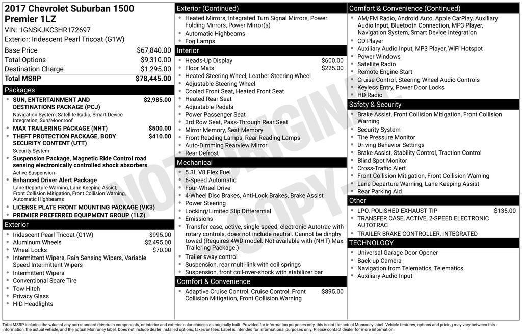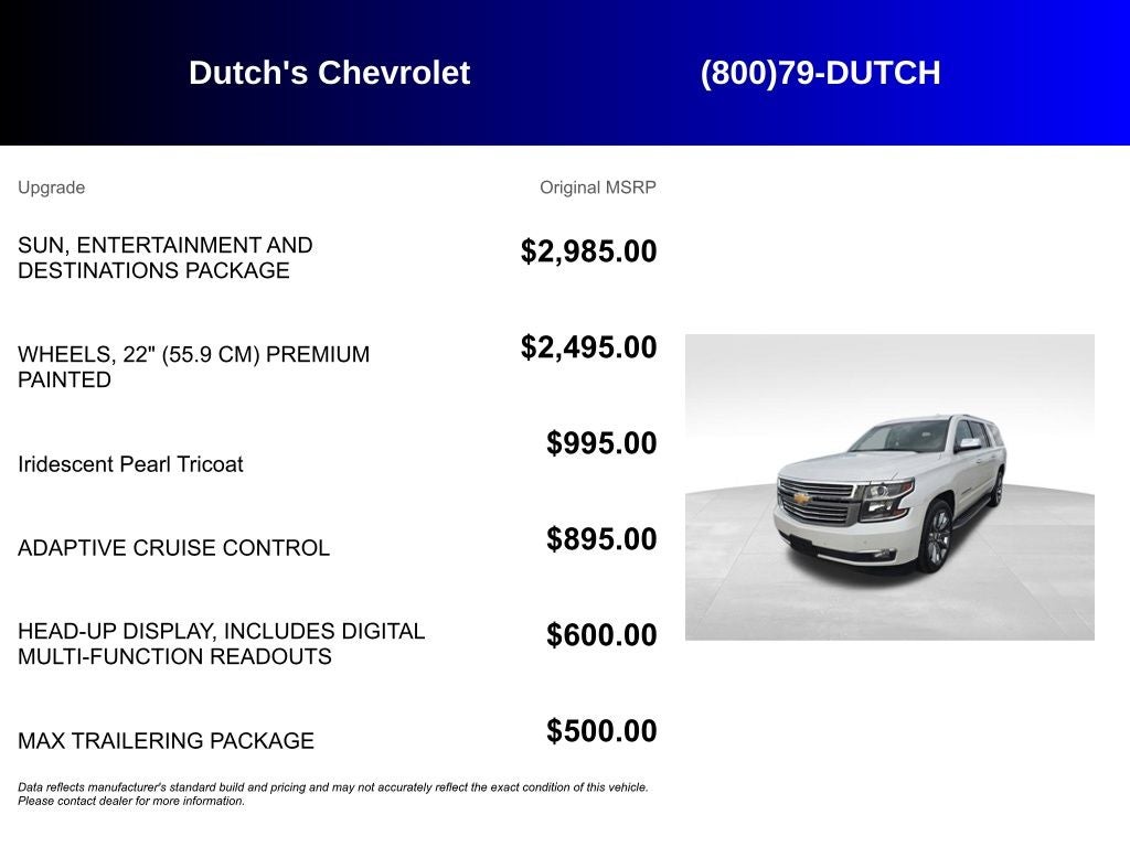 10 Speakers, 1st & 2nd Row Color-Keyed Carpeted Floor Mats, 2-Speed Active Electronic AutoTrac Transfer Case, 3rd Row 60/40 Power Fold Split-Bench, 3rd Row DVD Screen, 3rd row seats: split-bench, 4-Wheel Antilock Disc Brakes, 4-Wheel Disc & 4-Wheel VAC Power Antilock Brakes, 4-Wheel Disc Brakes, 6-Way Power Front Passenger Seat Adjuster, ABS brakes, Adaptive Cruise Control, Adaptive suspension, Adjustable pedals, Air Conditioning, All-Weather Floor Mats, Alloy wheels, AM/FM radio: SiriusXM, Apple CarPlay, Auto High-beam Headlights, Auto-dimming door mirrors, Auto-Dimming Inside Rear-View Mirror, Auto-dimming Rear-View mirror, Automatic Collision Preparation, Automatic temperature control, Black Assist Steps, Body Security Content Theft-Protection Package, Bodyside moldings, Bose Centerpoint Premium 10-Speaker Surround Sound, Brake assist, Bumpers: body-color, CD player, Color-Keyed Carpeting Floor Covering, Compass, Delay-off headlights, Driver door bin, Driver Inboard & Front Passenger Airbags, Driver vanity mirror, Dual front impact airbags, Dual front side impact airbags, Electronic Cruise Control w/Set & Resume Speed, Electronic Stability Control, Emergency communication system: OnStar Guidance, Enhanced Driver Alert Package, Enhanced Driver Information Center, Enhanced Driver Information Center (DISC), Extended-Range Remote Keyless Entry, Exterior Parking Camera Rear, Floor Console w/Storage Area, Fog Lamps, Forward Collision Alert Sensor Indicator, Front & Rear Parking Assist, Front anti-roll bar, Front Bucket Seats, Front Center Armrest, Front dual zone A/C, Front fog lights, Front reading lights, Front wheel independent suspension, Fully automatic headlights, Garage door transmitter, Hands Free Power Liftgate, HD Radio, Head-Up Display, Headphones, Heated & Vented Driver & Front Passenger Seats, Heated & Vented Front Reclining Bucket Seats, Heated 2nd Row Outboard Seats, Heated door mirrors, Heated front seats, Heated Leather Wrapped Steering Wheel, Heated rear seats, Heated steering wheel, High-Intensity Discharge Headlights, Illuminated entry, Integrated Trailer Brake Controller, Intellibeam Headlamps w/Automatic High Beam On/Off, Lane Keep Assist, Leather Shift Knob, License Plate Front Mounting Package, Low Speed Forward Automatic Braking, Low tire pressure warning, Magnetic Ride Control Suspension Package, Max Trailering Package, Memory seat, Memory Settings, Navigation System, NavTraffic, Occupant sensing airbag, OnStar Basic Plan For 5 Years, Outside temperature display, Overhead airbag, Overhead console, Panic alarm, Passenger door bin, Passenger vanity mirror, Passive Entry System, Pedal memory, Perforated Leather-Appointed Seat Trim, Polished Exhaust Tip, Power door mirrors, Power driver seat, Power Folding & Adjustable Heated Outside Mirrors, Power Liftgate, Power passenger seat, Power Release 2nd Row Bucket Seats, Power steering, Power Tilt & Telescoping Steering Column, Power Tilt-Sliding Sunroof w/Express-Open/Close, Power windows, Power-Adjustable Accelerator & Brake Pedals, Preferred Equipment Group 1LZ, Push Button Keyless Start, Radio: Chevrolet MyLink AM/FM Stereo w/Navigation, Rain sensing wipers, Rear air conditioning, Rear anti-roll bar, Rear audio controls, Rear Cross-Traffic Alert Sensor Indicator, Rear reading lights, Rear Seat Entertainment System, Rear window defroster, Rear window wiper, Remote keyless entry, Remote Vehicle Start, Roof rack: rails only, Roof-Mounted Luggage Rack Side Rails, Safety Alert Driver Seat, Security system, Side Blind Zone Alert w/Lane Change Alert, Single-Slot CD/MP3 Player, SiriusXM Satellite Radio, Speed control, Speed-sensing steering, Split folding rear seat, Spoiler, Steering wheel memory, Steering wheel mounted audio controls, Sun, Entertainment & Destinations Package, Tachometer, Telescoping st