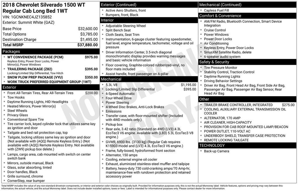 6-Speed Automatic Electronic with Overdrive, 4WD, Dark Ash With Jet Black Interior Accents Cloth, 110-Volt AC Power Outlet, 150 Amp Alternator, 170 Amp Alternator, 4-Wheel Disc Brakes, 40/20/40 Front Split Bench Seat, 6 Speakers, ABS brakes, Air Conditioning, AM/FM radio, Auxiliary External Transmission Oil Cooler, Black Power Adjustable Heated Outside Mirrors, Bluetooth® For Phone, Brake assist, Chevrolet Connected Access, Chevrolet w/4G LTE, Chrome Grille Surround, Cloth Seat Trim, Deep-Tinted Glass, Delay-off headlights, Driver door bin, Driver Information Center, Dual front impact airbags, Dual front side impact airbags, Electronic Stability Control, Exterior Parking Camera Rear, Front anti-roll bar, Front Center Armrest w/Storage, Front Chrome Bumper, Front reading lights, Front wheel independent suspension, Fully automatic headlights, Graphite-Colored Rubberized-Vinyl Floor Covering, Heavy Duty Suspension, Heavy-Duty Rear Locking Differential, High-Intensity Discharge Headlights, Integrated Trailer Brake Controller, Low tire pressure warning, Manual Tilt Wheel Steering Column, Occupant sensing airbag, OnStar & Chevrolet Connected Services Capable, Overhead airbag, Overhead console, Passenger door bin, Passenger vanity mirror, Power steering, Power Windows w/Driver Express Up, Premium audio system: Chevrolet MyLink, Provision for Cab Roof-Mounted Lamp/Beacon, Radio data system, Radio: AM/FM w/7 Diagonal Color Touch Screen, Rear Chrome Bumper, Rear step bumper, Remote Keyless Entry, Remote Locking Tailgate, Snow Plow Prep Package, Speed control, Speed-sensing steering, Tachometer, Tilt steering wheel, Traction control, Trailering Package, Trip computer, Variably intermittent wipers, Voltmeter, 6-Speed Automatic Electronic with Overdrive, 4WD, Dark Ash With Jet Black Interior Accents Cloth.