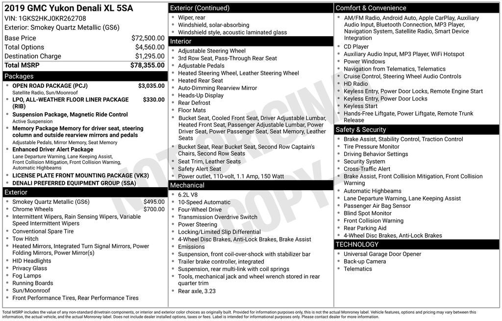 Service Records Available, Bluetooth® / Hands-free Calling, Moonroof/Sunroof, Rear BackUp Camera, Leather, Navigation GPS, 4WD / 4 Wheel Drive, Rear Entertainment DVD, Non Smoker, Local Trade, Heated Seats, 4WD, 10 Speakers, 3.23 Rear Axle Ratio, 3rd Row DVD Screen, 3rd row seats: split-bench, 4-Wheel Antilock Disc Brakes, 4-Wheel Disc Brakes, 5 Auxiliary 12-volt Power Outlets, ABS brakes, Adaptive suspension, Adjustable pedals, Air Conditioning, All-Weather Floor Liner Package (LPO), Alloy wheels, AM/FM radio: SiriusXM, Apple CarPlay/Android Auto, Auto High-beam Headlights, Auto-dimming door mirrors, Auto-dimming Rear-View mirror, Automatic temperature control, Black Assist Steps w/Chrome Strip, Bodyside moldings, Bose Active Noise Cancellation, Bose Centerpoint Surround Sound Audio System, Brake assist, Bumpers: body-color, CD Player, CD player, Compass, Delay-off headlights, Driver door bin, Driver vanity mirror, Dual front impact airbags, Dual front side impact airbags, Electronic Stability Control, Emergency communication system: OnStar and GMC connected services capable, Enhanced Driver Alert Package, Exterior Parking Camera Rear, Forward Collision Alert, Front anti-roll bar, Front Bucket Seats, Front Center Armrest, Front dual zone A/C, Front fog lights, Front reading lights, Front wheel independent suspension, Full-Feature Reclining Bucket Seats, Fully automatic headlights, Garage door transmitter, Genuine wood console insert, Genuine wood dashboard insert, Genuine wood door panel insert, Hands Free Power Programmable Rear Liftgate, Heads-Up Display, Heated & Ventilated Driver & Front Passenger Seats, Heated door mirrors, Heated front seats, Heated Leather-Wrapped Steering Wheel, Heated rear seats, Heated steering wheel, High-Intensity Discharge Headlights, Illuminated entry, Inside Rear-View Auto-Dimming Mirror, Integrated Trailer Brake Controller, IntelliBeam Automatic High Beam On/Off, Lane Change Alert w/Side Blind Zone Alert, Lane Keep Assist w/Lane Departure Warning, Leather Shift Knob, License Plate Front Mounting Package, Low Speed Forward Automatic Braking, Low tire pressure warning, Magnetic Ride Control Suspension Package, Memory Package, Memory seat, Navigation System, Occupant sensing airbag, Open Road Package, Outside temperature display, Overhead airbag, Overhead console, Panic alarm, Passenger door bin, Passenger vanity mirror, Passive Entry System, Pedal memory, Perforated Leather-Appointed Seat Trim, Power door mirrors, Power driver seat, Power Liftgate, Power passenger seat, Power Release 2nd Row Bucket Seats, Power steering, Power Tilt & Telescopic Steering Column, Power Tilt-Sliding Sunroof w/Express-Open/Close, Power windows, Power-Adjustable Pedals For Accelerator & Brake, Preferred Equipment Group 5SA, Premium audio system: IntelliLink, Push Button Keyless Start, Radio: AM/FM/SiriusXM w/Navigation, Rain sensing wipers, Rear air conditioning, Rear anti-roll bar, Rear Cross Traffic Alert, Rear reading lights, Rear Seat Blu-Ray/DVD Entertainment System, Rear window defroster, Rear window wiper, Remote Keyless Entry, Remote keyless entry, Roof rack: rails only, Security system, Sirius