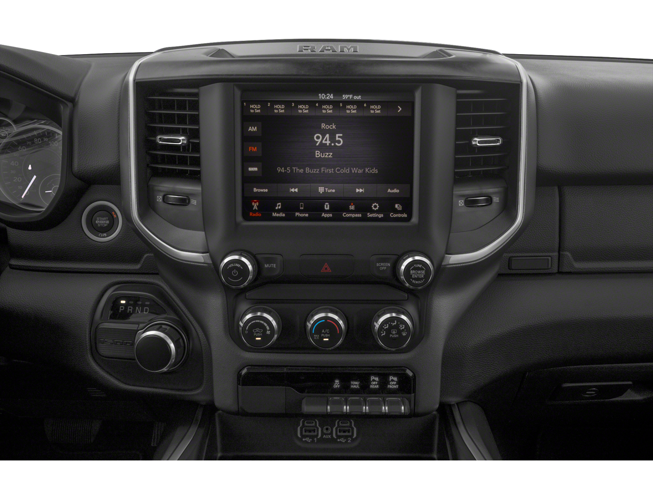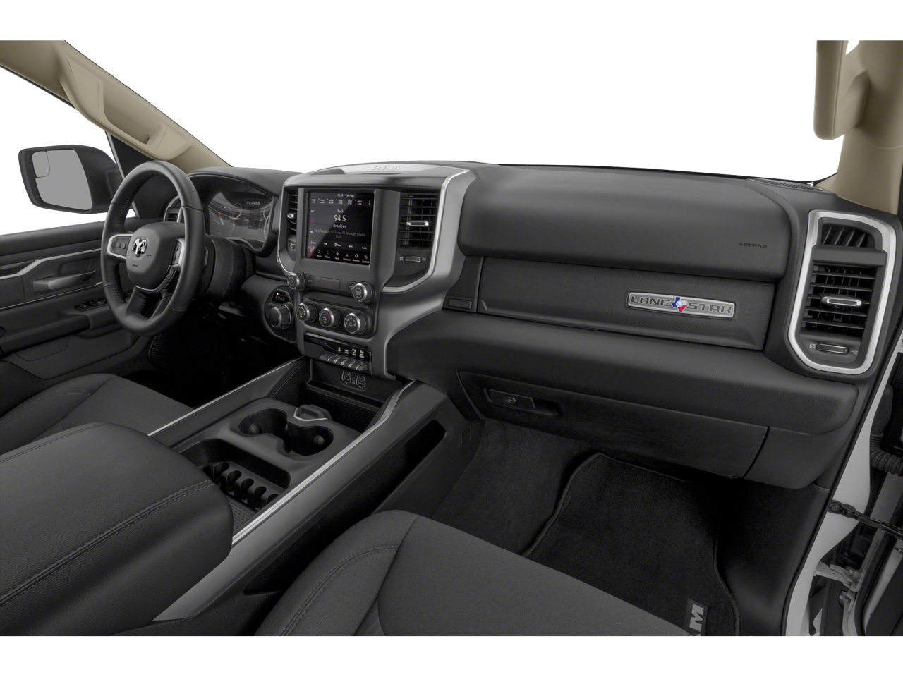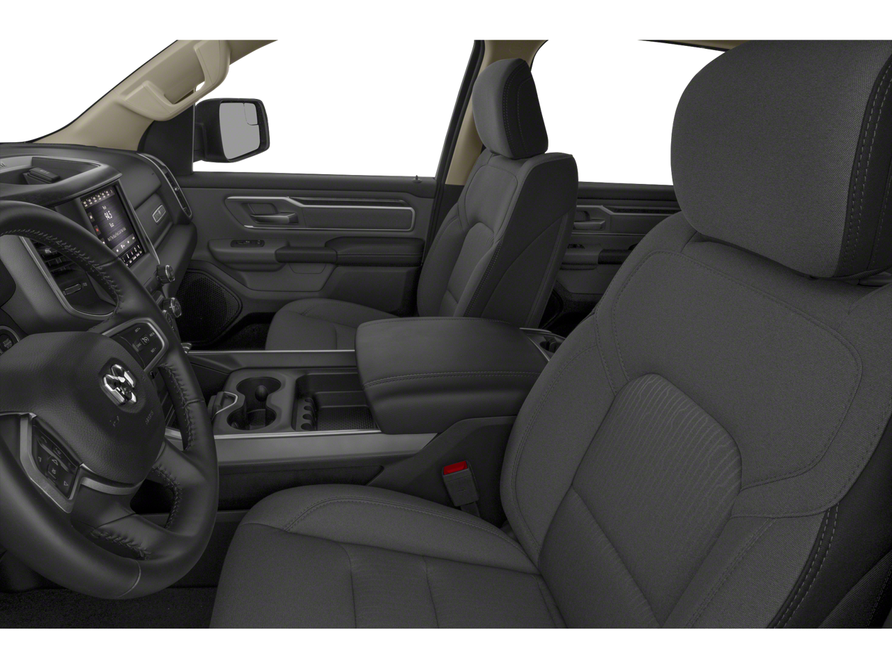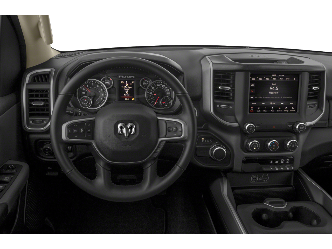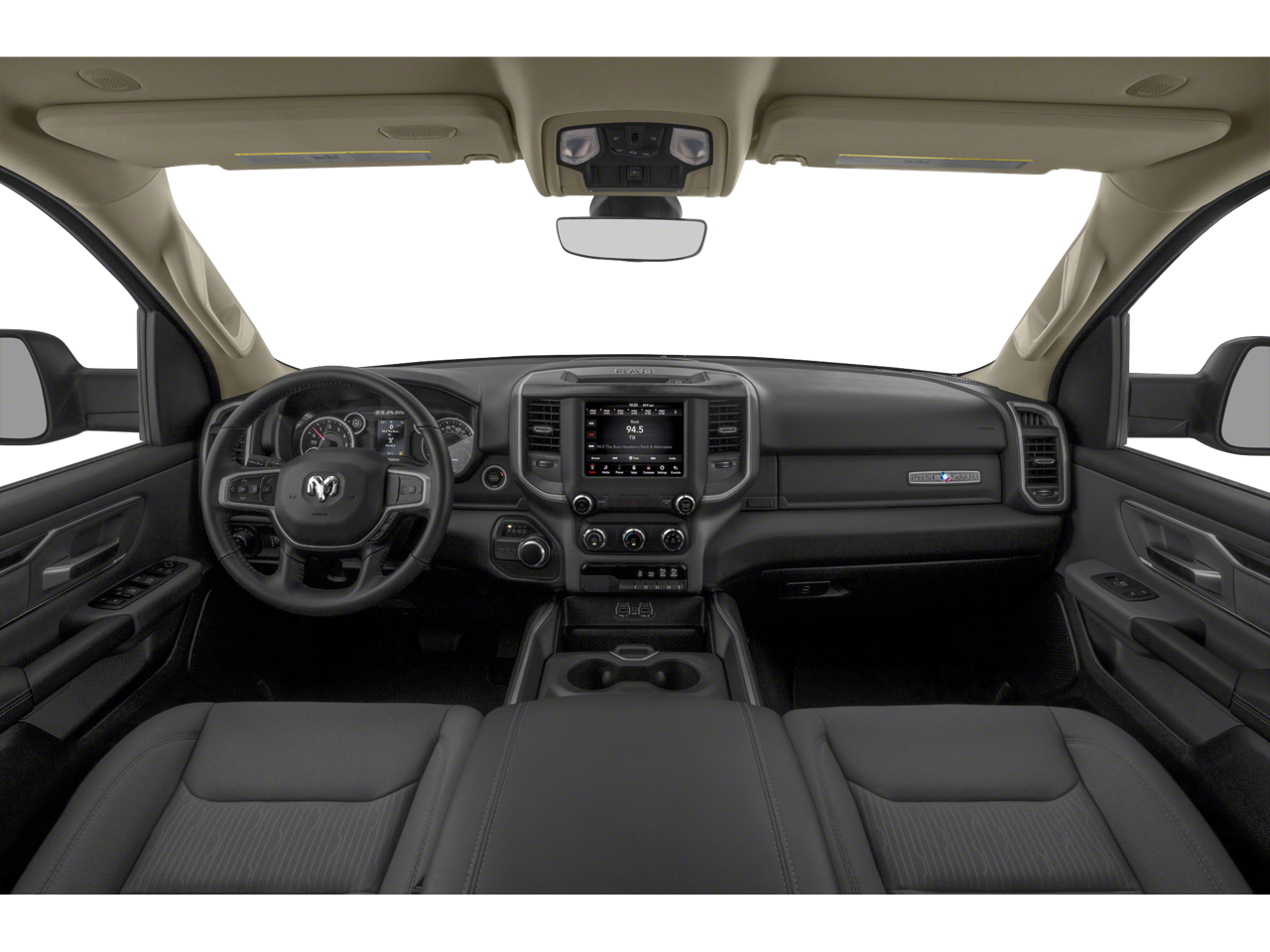 115V Auxiliary Power Outlet, 115V Auxiliary Rear Power Outlet, 2 USB Full Function/Charge Only Media Hub, 3 Rear Seat Head Restraints, 3.21 Rear Axle Ratio, 4 Way Front Headrests, 4-Wheel Disc Brakes, 400W Inverter, 48V Belt Starter Generator, 6 Speakers, ABS brakes, Air Conditioning, Air Conditioning ATC w/Dual Zone Control, Alloy wheels, AM/FM radio, Auto-Dimming Rear-View Mirror, Big Horn IP Badge, Big Horn Level 2 Equipment Group, Black Premium Power Mirrors, Brake assist, Bumpers: chrome, Class IV Receiver Hitch, Cloth Bench Seat, Cluster 7.0 TFT Color Display, Compass, Dampened Tailgate, Delay-off headlights, Driver door bin, Dual front impact airbags, Dual front side impact airbags, Electronic Stability Control, Foam Bottle Insert (Door Trim Panel), Front anti-roll bar, Front Center Armrest w/Storage, Front fog lights, Front reading lights, Front Seat Back Map Pockets, Front wheel independent suspension, Fully automatic headlights, Glove Box Lamp, GPS Antenna Input, Heated door mirrors, Heated Front Seats, Heated Steering Wheel, Illuminated entry, Leather steering wheel, Low tire pressure warning, Manual Adjust 4-Way Front Passenger Seat, Manufacturer's Statement of Origin, Occupant sensing airbag, Outside temperature display, Overhead airbag, Overhead console, Panic alarm, ParkSense Front/Rear Park Assist w/Stop, ParkView Rear Back-Up Camera, Passenger door bin, Passenger vanity mirror, Power 4-Way Driver Lumbar Adjust, Power 8-Way Driver Seat, Power Adjustable Pedals, Power door mirrors, Power steering, Power windows, Quick Order Package 25Z Big Horn, Radio data system, Radio: Uconnect 3 w/5 Display, Radio: Uconnect 4 w/8.4 Display, Rear 60/40 Folding Seat, Rear anti-roll bar, Rear Dome w/On/Off Switch Lamp, Rear Power Sliding Window, Rear seat center armrest, Rear step bumper, Rear Window Defroster, Remote keyless entry, Remote Start System, Security Alarm, SiriusXM Satellite Radio, Speed control, Split folding rear seat, Steering wheel mounted audio controls, Sun Visors w/Illuminated Vanity Mirrors, Tachometer, Telescoping steering wheel, Tilt steering wheel, Traction control, Trip computer, Universal Garage Door Opener, Variably intermittent wipers, Voltmeter, Wheels: 18 x 8 Cast-Aluminum Painted.