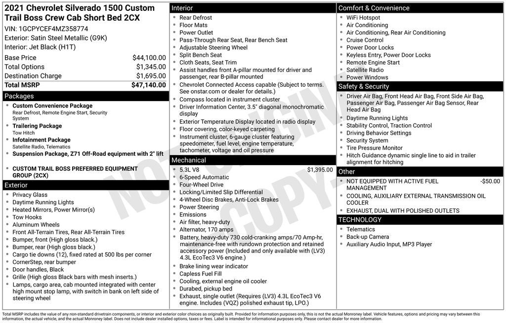 - Custom Convenience Package includes (BTV) Remote Start with (UTJ) content theft alarm, (C49) rear-window defogger, (UF2) bed LED cargo area lighting and (QT5) EZ Lift power lock and release tailgate