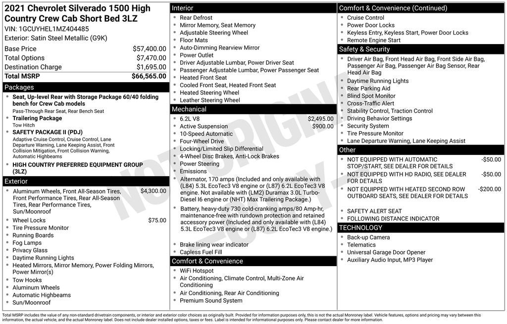 Clean CarFax/No Accidents, Service Records Available, Remainder of Factory Warranty, Bluetooth® / Hands-free Calling, Moonroof/Sunroof, Rear BackUp Camera, Leather, 4WD / 4 Wheel Drive, Non Smoker, Local Trade, Heated Seats, 10-Speed Automatic, 4WD, Jet Black Leather, 10-Way Power Driver Seat w/Lumbar, 10-Way Power Passenger Seat Adjuster w/Lumbar, 12-Volt Rear Auxiliary Power Outlet, 120-Volt Bed Mounted Power Outlet, 120-Volt Instrument Panel Power Outlet, 8 Driver Information Center, Advanced Trailering System, All-Weather Floor Liner (LPO), Auto-Dimming Inside Rear-View Mirror, Auto-Locking Rear Differential, Auxiliary External Transmission Oil Cooler, Bluetooth® For Phone, Chevytec Spray-On Black Bedliner, Chrome Assist Steps, Chrome Grille, Chrome Recovery Hooks, Color-Keyed Carpeting Floor Covering, Compass, Deep-Tinted Glass, Driver Memory, Dual Exhaust w/Polished Outlets, Electric Rear-Window Defogger, Electrical Lock Control Steering Column, Electronic Cruise Control, Floor Mounted Center Console, Front Carpeted Floor Mats, Front LED Fog Lamps, HD Rear Vision Camera, Heated Driver & Front Outboard Passenger Seats, Heated Steering Wheel, High Country Deluxe, Hitch Guidance, Hitch Guidance w/Hitch View, Integrated Trailer Brake Controller, Keyless Open & Start, Lane Change Alert w/Side Blind Zone Alert, Leather Wrapped Steering Wheel, LED Cargo Area Lighting, Manual Tilt/Telescoping Steering Column, OnStar & Chevrolet Connected Services Capable, Outside Heated Power-Adjustable Mirrors, Painted Mirror Caps, Power Door Locks, Power Front Passenger Windows w/Express Up/Down, Power Front Windows w/Driver Express Up/Down, Power Rear Windows w/Express Down, Power Sliding Rear Window w/Rear Defogger, Power Sunroof, Power Tailgate, Preferred Equipment Group 3LZ, Rear Carpeted Floor Mats, Rear Cross Traffic Alert, Rear Dual USB Charging-Only Ports, Rear Wheelhouse Liners, Remote Vehicle Starter System, Safety Package II, SiriusXM w/360L, Standard Tailgate, Steering Wheel Audio Controls, Theft Deterrent System (Unauthorized Entry), Trailering Package, Ultrasonic Front & Rear Park Assist, Universal Home Remote, Up-Level Rear Seat w/Storage Package, Ventilated Driver & Front Passenger Seats, Wireless Charging, Wireless Phone Projection.