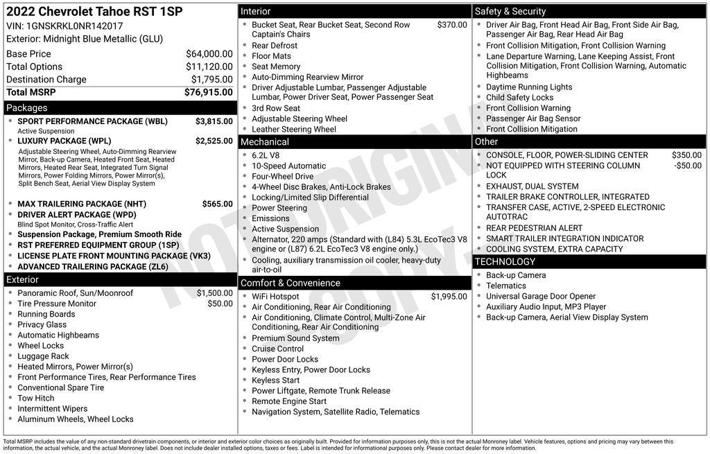 Midnight Blue Metallic 2022 Chevrolet 4D Sport Utility Tahoe RST EcoTec3 6.2L V8 4WD