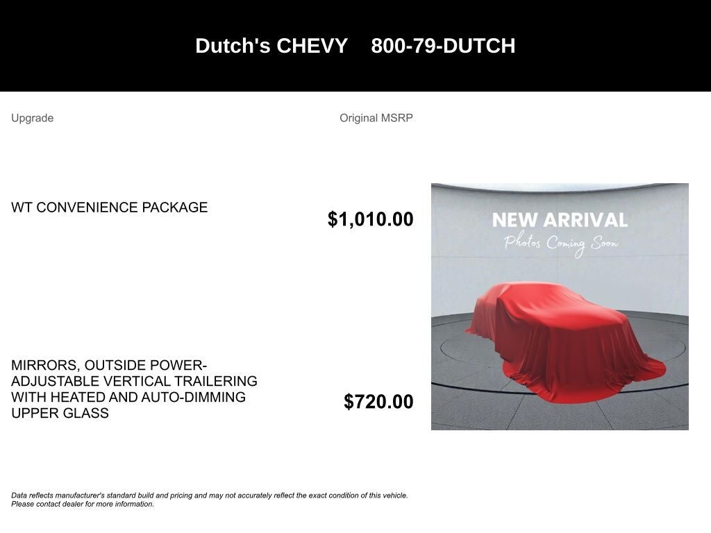 10-Speed Automatic, Jet Black Vinyl, 120-Volt Interior Power Outlet, 170 Amp Alternator, 3.5 Diagonal Monochromatic Display DIC, 3.73 Rear Axle Ratio, 4-Wheel Disc Brakes, 6 Speakers, 6-Speaker Audio System, 720 Cold-Cranking Amps Heavy-Duty Battery, ABS brakes, Air Conditioning, AM/FM radio, Apple CarPlay/Android Auto, Auto High-beam Headlights, Auto-Dimming Inside Rear-View Mirror, Black Front Bumper, Black Mirror Caps, Black Rear Bumper, Bluetooth® For Phone, Brake assist, Chevrolet Connected Access Capable, Chrome Front Bumper, Compass, Deep-Tinted Glass, Delay-off headlights, Driver door bin, Dual front impact airbags, Dual front side impact airbags, Dual Rear USB Ports (Charge Only), Durabed Pickup Bed, Electric Rear-Window Defogger, Electronic Cruise Control w/Set & Resume Speed, Electronic Stability Control, EZ Lift Power Lock & Release Tailgate, Front 40/20/40 Split-Bench Seats w/Lockable Storage, Front anti-roll bar, Front Center Armrest w/Storage, Front License Plate Kit, Front reading lights, Front wheel independent suspension, Fully automatic headlights, HD Rear Vision Camera, Heated & Auto-Dimming Vertical Trailering Mirrors, Heated Vertical Trailering Mirrors, High-Visibility Vertical Trailering Mirrors, Illuminated entry, Integrated Trailer Brake Controller, Locking Tailgate, Low tire pressure warning, Manual Tailgate Function w/No EZ Lift, Manual Tilt-Wheel Steering Column, Not Equipped w/Rear USB Ports, Occupant sensing airbag, OnStar & Chevrolet Connected Services Capable, Outside temperature display, Overhead airbag, Overhead console, Panic alarm, Passenger door bin, Passenger vanity mirror, Power Door Locks, Power Front Windows w/Driver Express Up/Down, Power Rear Windows w/Express Down, Power steering, Power windows, Preferred Equipment Group 1WT, Premium audio system: Chevrolet Infotainment 3, Push Button Start, Radio: Chevrolet Infotainment 3 System, Rear 60/40 Folding Bench Seat (Folds Up), Rear reading lights, Rear step bumper, Remote Keyless Entry, Remote keyless entry, Rubberized-Vinyl Floor Covering, Solar Absorbing Tinted Glass, Split folding rear seat, Standard Tailgate, Suspension Package, Tachometer, Tilt steering wheel, Traction control, Trip computer, Upfitter Switch Kit (5), Variably intermittent wipers, Vinyl Seat Trim, Voltmeter, Wheels: 17 Silver Painted Steel, Wi-Fi Hotspot Capable, Wireless Phone Projection, WT Convenience Package, 10-Speed Automatic, Jet Black Vinyl.