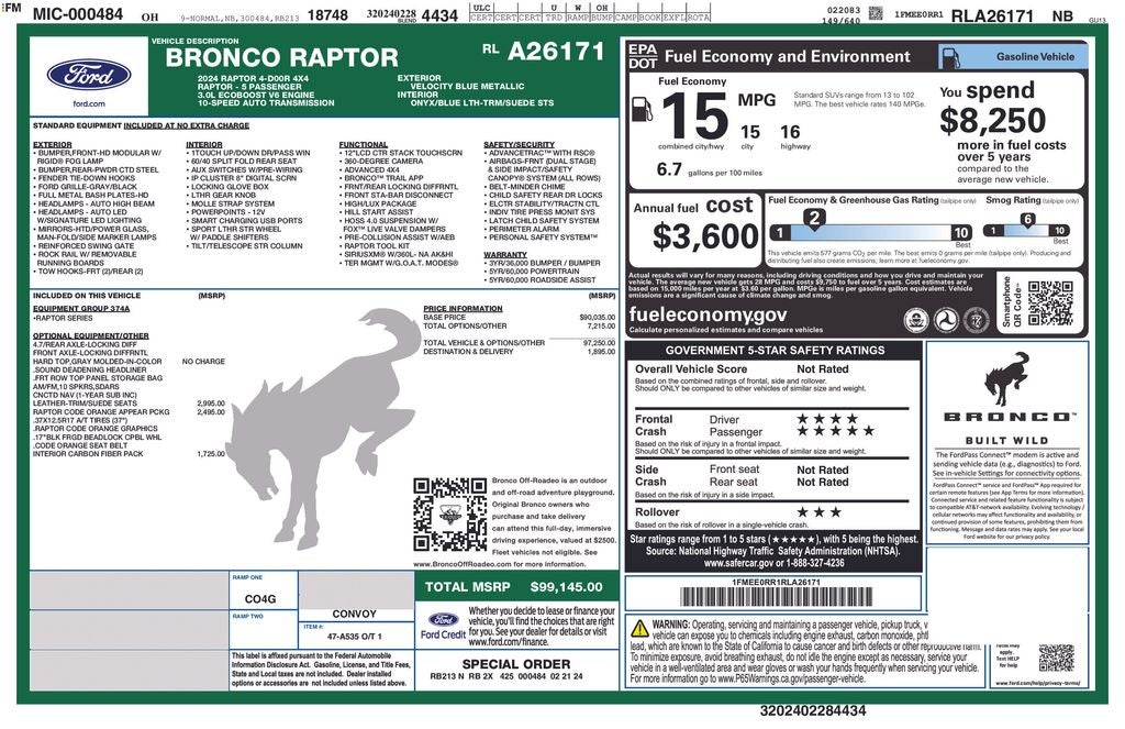 Blue Metallic 2024 Ford 4D Sport Utility Bronco Raptor 3.0L EcoBoost V6 4WD