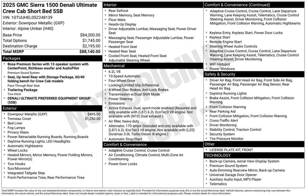 One Owner, Clean CarFax/No Accidents, Service Records Available, Remainder of Factory Warranty, Bluetooth® / Hands-free Calling, Moonroof/Sunroof, Rear BackUp Camera, Leather, Navigation GPS, 4WD / 4 Wheel Drive, Non Smoker, Heated Seats, 10-Speed Automatic, 4WD, Alpine Umber Leather, 120-Volt Interior Power Outlet, 2 Charge/Data USB Ports Inside Center Console, 2 Type-C Charge-Only Rear USB Ports, 2 USB Ports, Auto-Locking Rear Differential, Bed View Camera, Bose Premium Series w/12-Speaker System, Chrome Recovery Hooks, Color-Keyed Carpeting Floor Covering, Deep-Tinted Glass, Electric Rear-Window Defogger, Floor-Mounted Center Console, Front Rain-Sensing Wipers, HD Surround Vision, Heated 2nd Row Outboard Seats, Heated Driver & Front Outboard Passenger Seating, Heavy-Duty Air Filter, High Gloss Black Header w/Signature Denali Grille, Hill Descent Control, Hitch View, In-Vehicle Trailering System App, Integrated Trailer Brake Controller, Keyless Open & Start, LED Cargo Area Lighting, Multicolor 15 Diagonal Head-Up Display, MultiPro Tailgate Audio System by Kicker (LPO), Navigation System, OnStar Services Capable, Perimeter Lighting, Power Door Locks, Power Front Passenger Windows w/Express Up/Down, Power Front Windows w/Driver Express Up/Down, Power Rake & Telescoping Steering Column, Power Rear Windows w/Express Down, Power Sliding Rear Window w/Rear Defogger, Power Sunroof, Preferred Equipment Group 5SB, Push Button Start, Rear Cross Traffic Braking, Rear Pedestrian Detection, Rear Wheelhouse Liners, Remote Vehicle Starter System, SiriusXM w/360L Trial Subscription, Spray-On Pickup Bedliner w/GMC Logo, Steering Wheel Audio Controls, Theft Deterrent System (Unauthorized Entry), Trailer Camera Provisions, Trailer Side Blind Zone Alert, Trailer Tire Pressure Monitor System, Trailering Package, Ultrasonic Front & Rear Park Assist, Universal Home Remote, Ventilated Driver & Front Passenger Seats, Wi-Fi Hotspot Capable, Wireless Charging.
