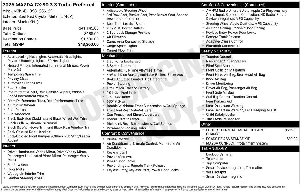 2nd-Row Captain's Chairs, 3rd row seats: bench, 4-Wheel Disc Brakes, 8 Speakers, ABS brakes, Air Conditioning, Alloy wheels, AM/FM radio, Auto High-beam Headlights, Automatic temperature control, Brake assist, Bumpers: body-color, Compass, Delay-off headlights, Driver door bin, Driver vanity mirror, Dual front impact airbags, Dual front side impact airbags, E911 Automatic Emergency Notification, Electronic Stability Control, Emergency communication system: MAZDA CONNECT, Exterior Parking Camera Rear, Four wheel independent suspension, Front anti-roll bar, Front Bucket Seats, Front Center Armrest w/Storage, Front dual zone A/C, Front reading lights, Fully automatic headlights, Heated door mirrors, Heated Front Bucket Seats, Heated front seats, Illuminated entry, Infotainment System Voice Command, Knee airbag, Leather Seat Trim, Leather Shift Knob, Leather steering wheel, Low tire pressure warning, Mazda Connected Services, Occupant sensing airbag, Outside temperature display, Overhead airbag, Overhead console, Pandora Internet Radio Integration, Panic alarm, Passenger door bin, Passenger vanity mirror, Power door mirrors, Power driver seat, Power Liftgate, Power moonroof, Power passenger seat, Power steering, Power windows, Radio Broadcast Data System Program Information, Radio data system, Radio: AM/FM w/HD/8-Speaker Sound System, Rain sensing wipers, Rear air conditioning, Rear anti-roll bar, Rear reading lights, Rear seat center armrest, Rear window defroster, Rear window wiper, Remote keyless entry, Roadside Assistance Kit, SMS Text Msg Audio Delivery & Reply, Soul Red Crystal Metallic Paint Charge, Speed control, Speed-sensing steering, Split folding rear seat, Spoiler, Steering wheel mounted audio controls, Tachometer, Telescoping steering wheel, Tilt steering wheel, Traction control, Trip computer, Turn signal indicator mirrors, Variably intermittent wipers, Wheels: 19 x 8.5J Aluminum Alloy.